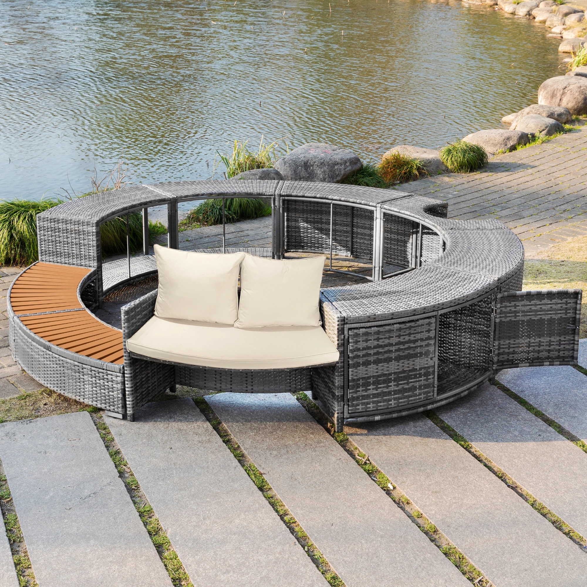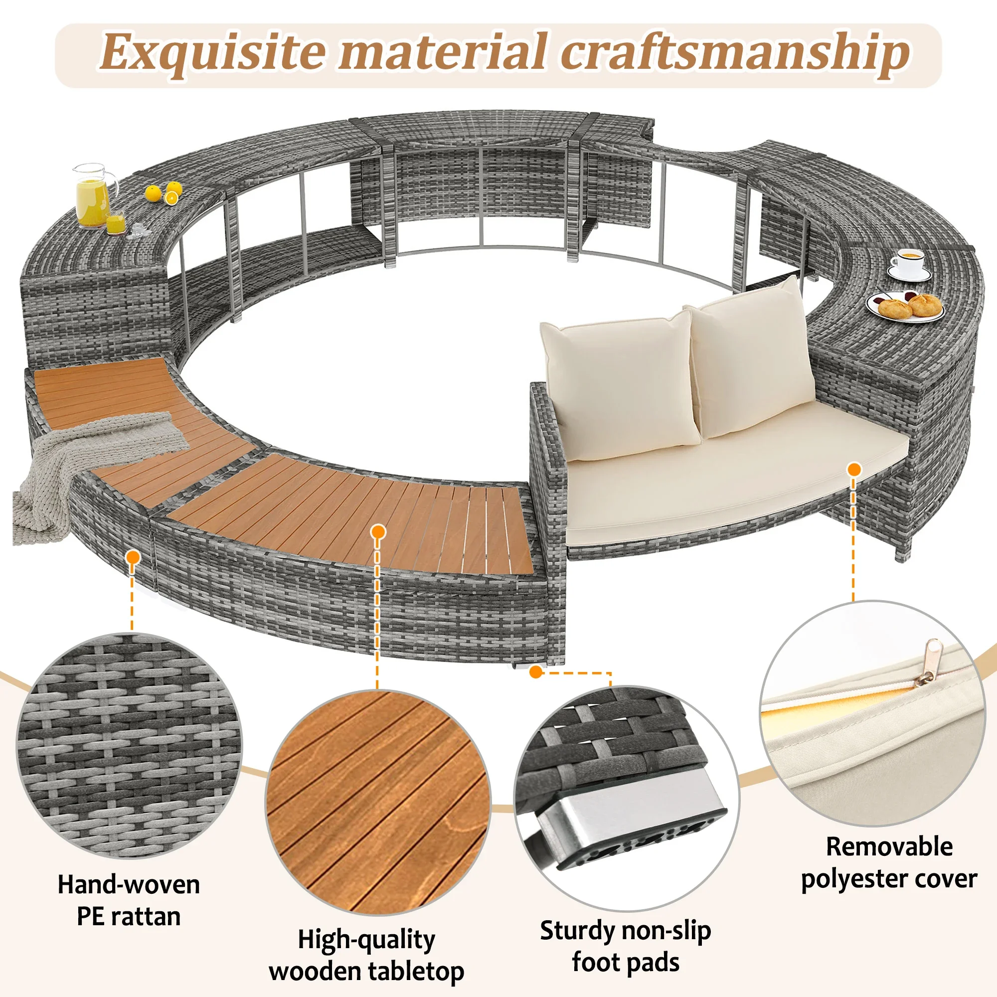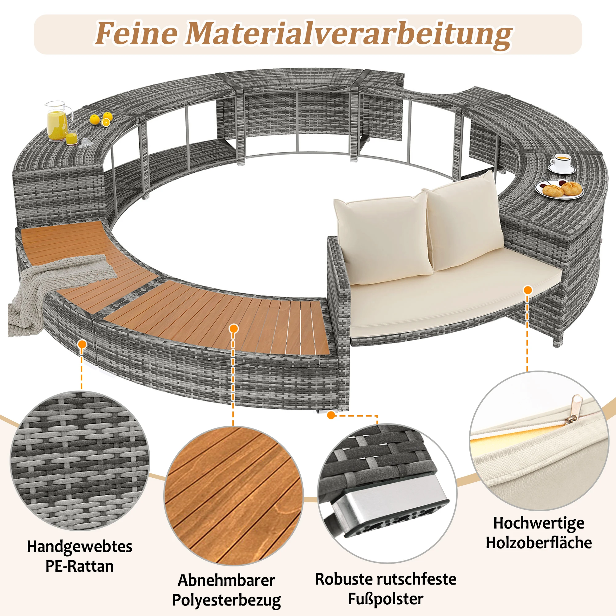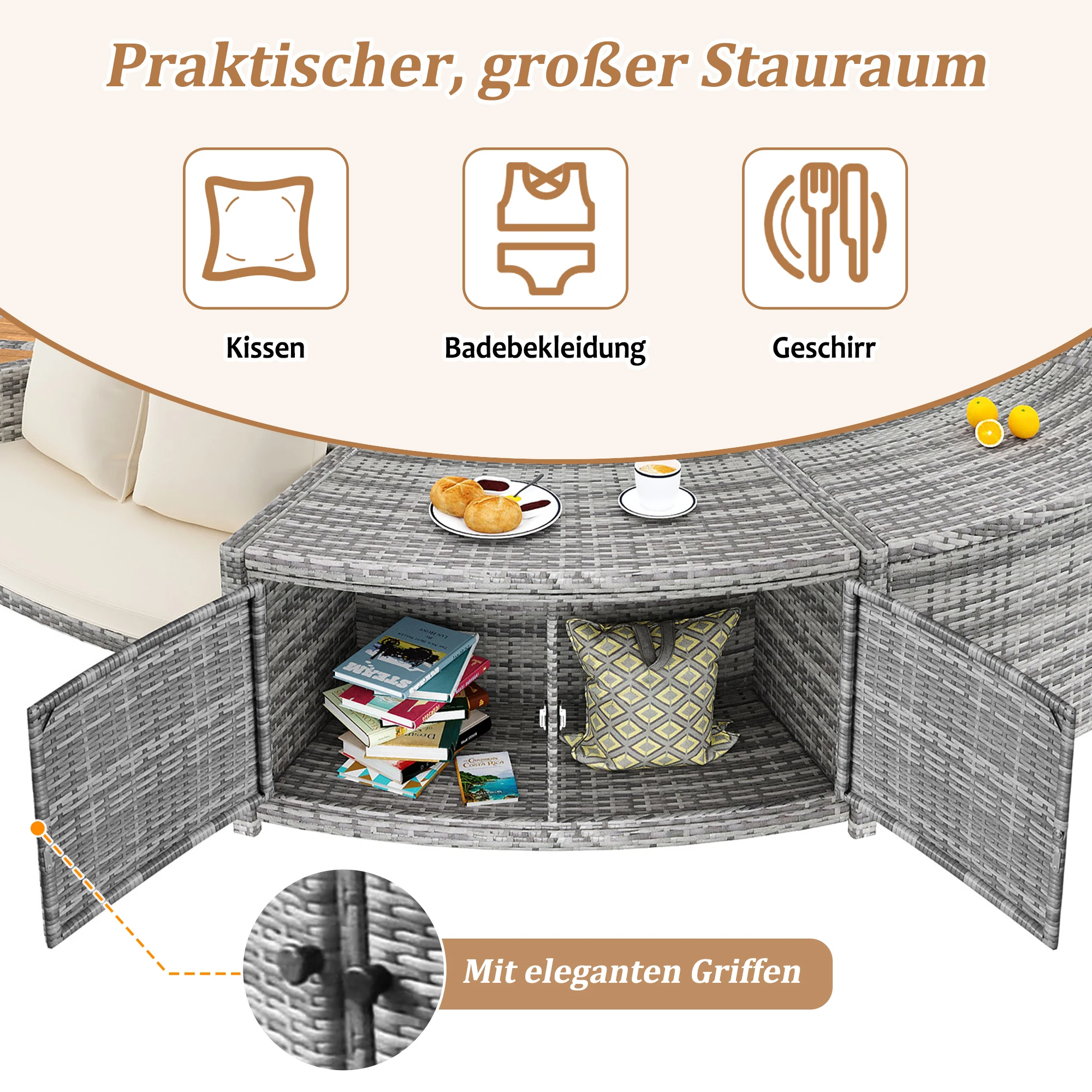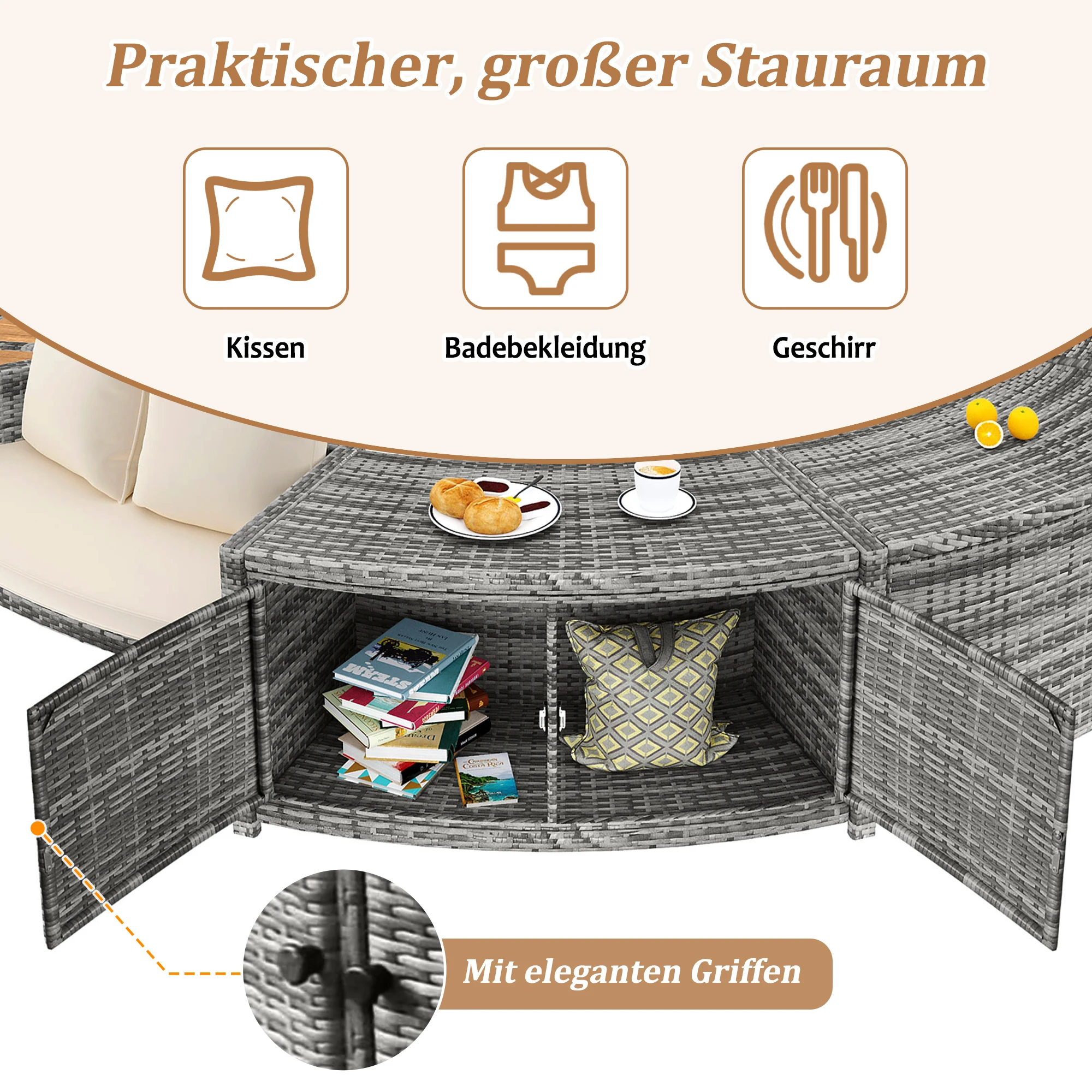 Diese Sofagarnitur verfügt über mehrere Stauräume, darunter Staufächer unter der Sitzfläche und an der Seite, die zur Aufbewahrung von Outdoor-Artikeln wie Kissen, Decken oder Zeitschriften genutzt werden können, um Ihren Außenbereich ordentlich und organisiert zu halten. Darüber hinaus ist eine Seite des Sofas mit einer kleinen ausziehbaren Holztischplatte ausgestattet, auf der Sie bequem Getränke oder Snacks abstellen können, um Ihr Leben im Freien entspannter und angenehmer zu gestalten.