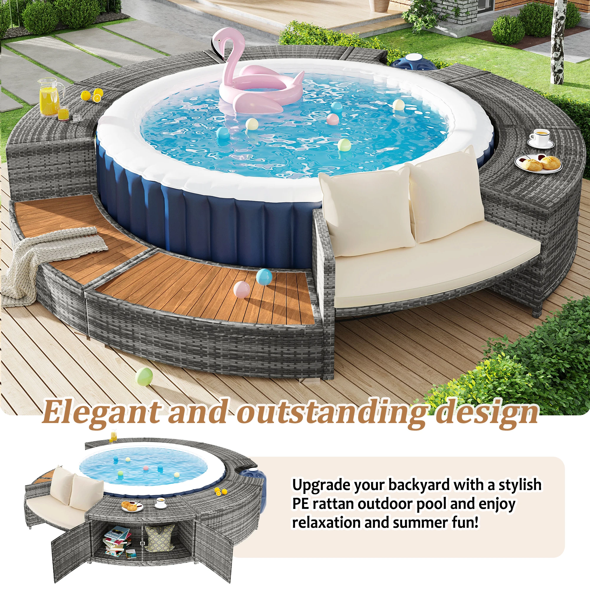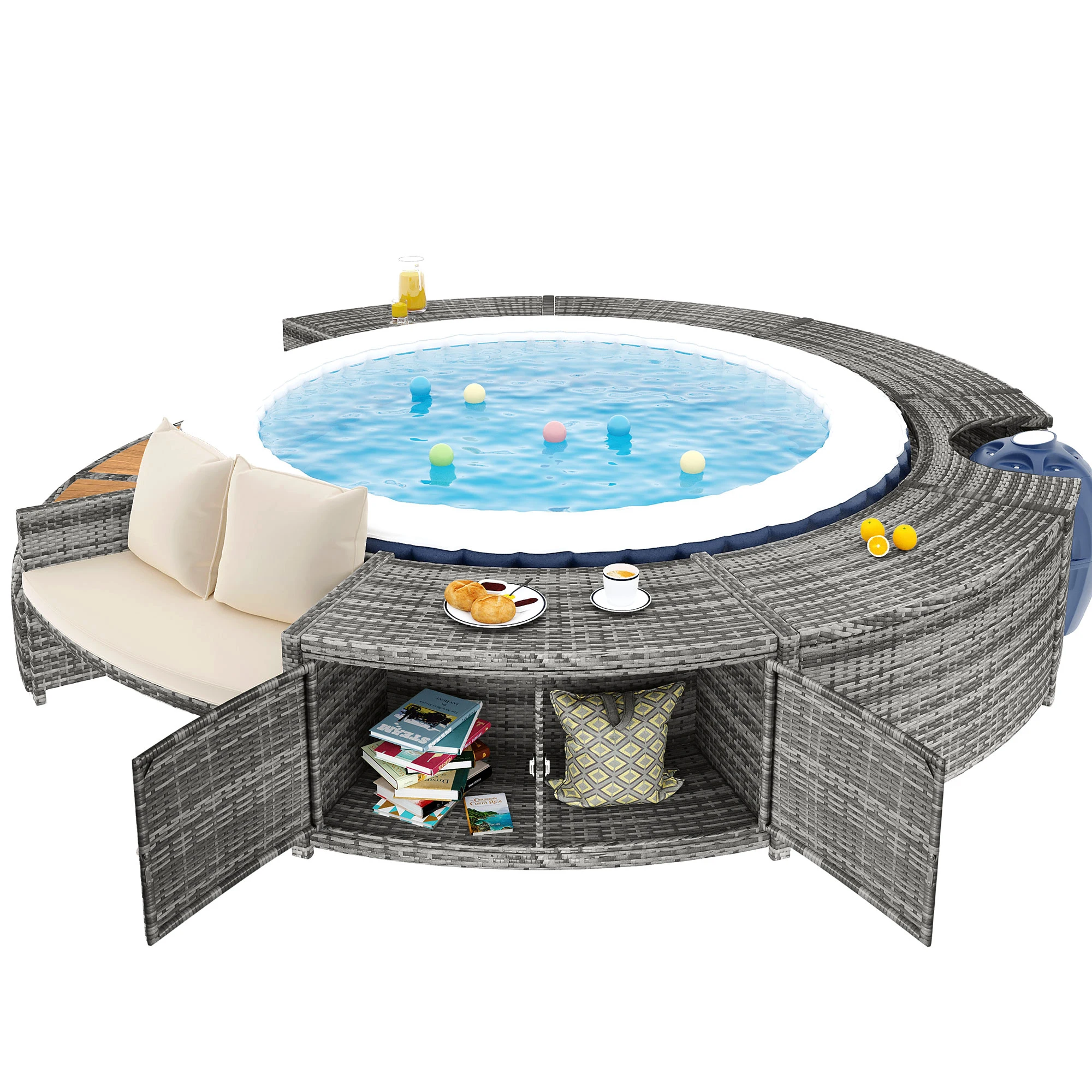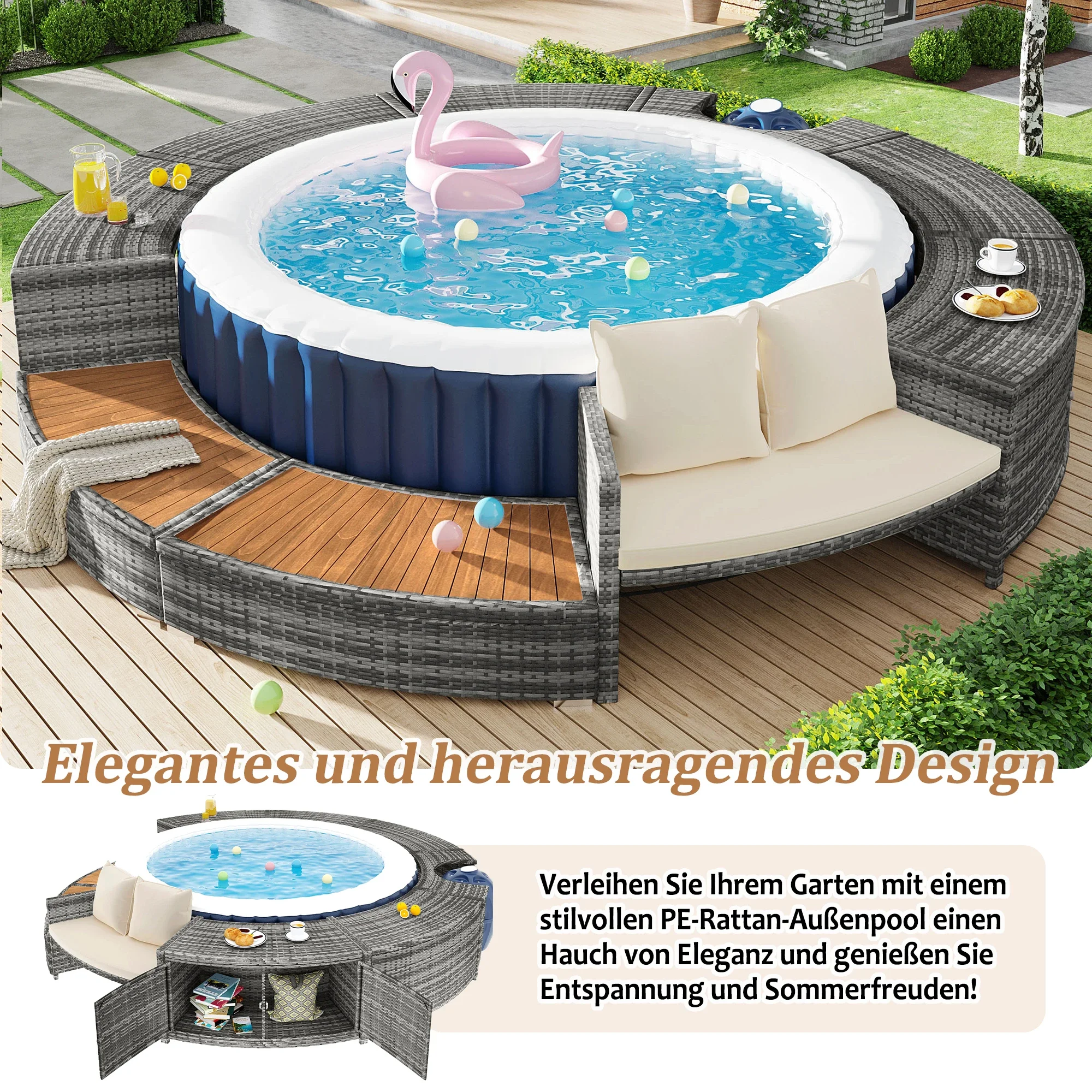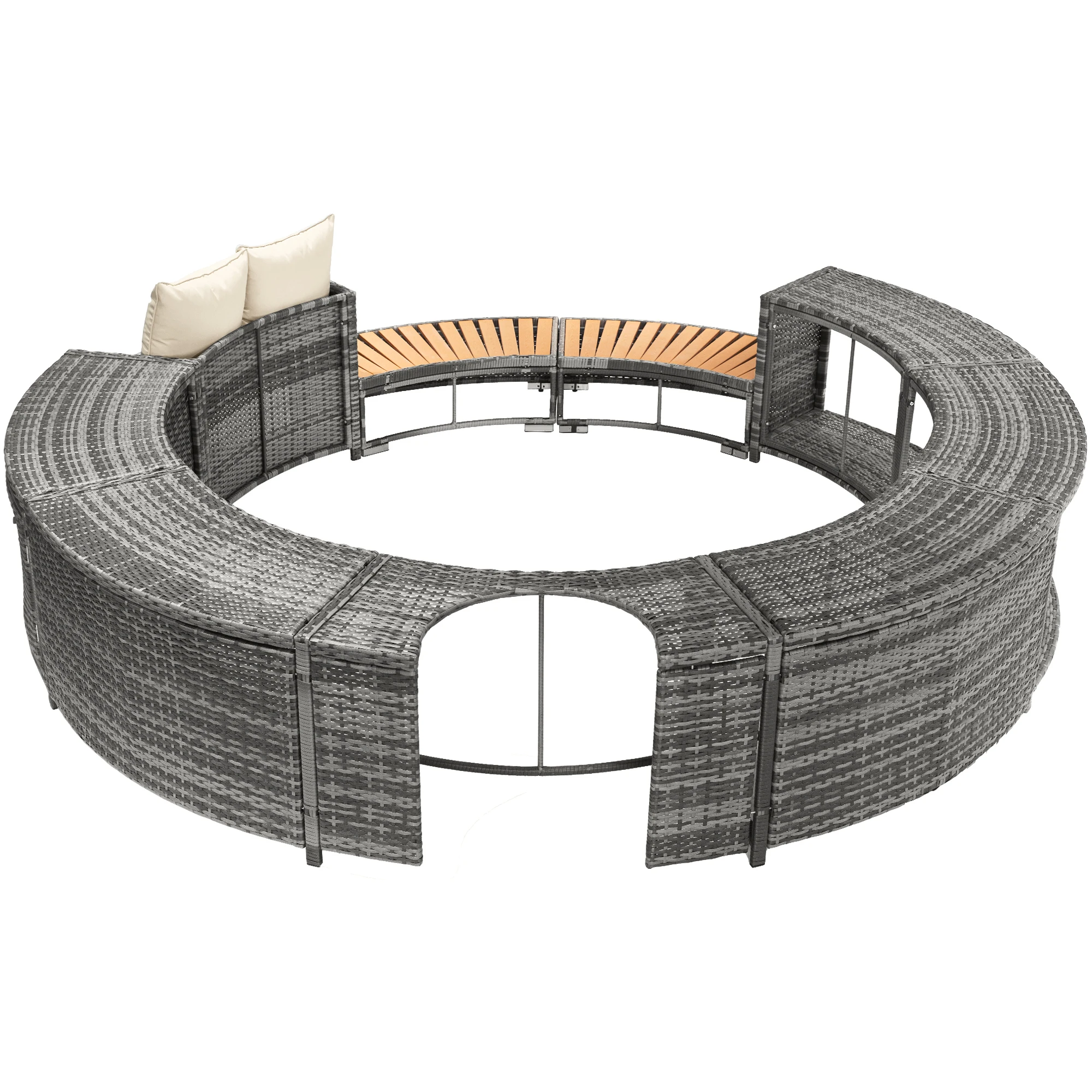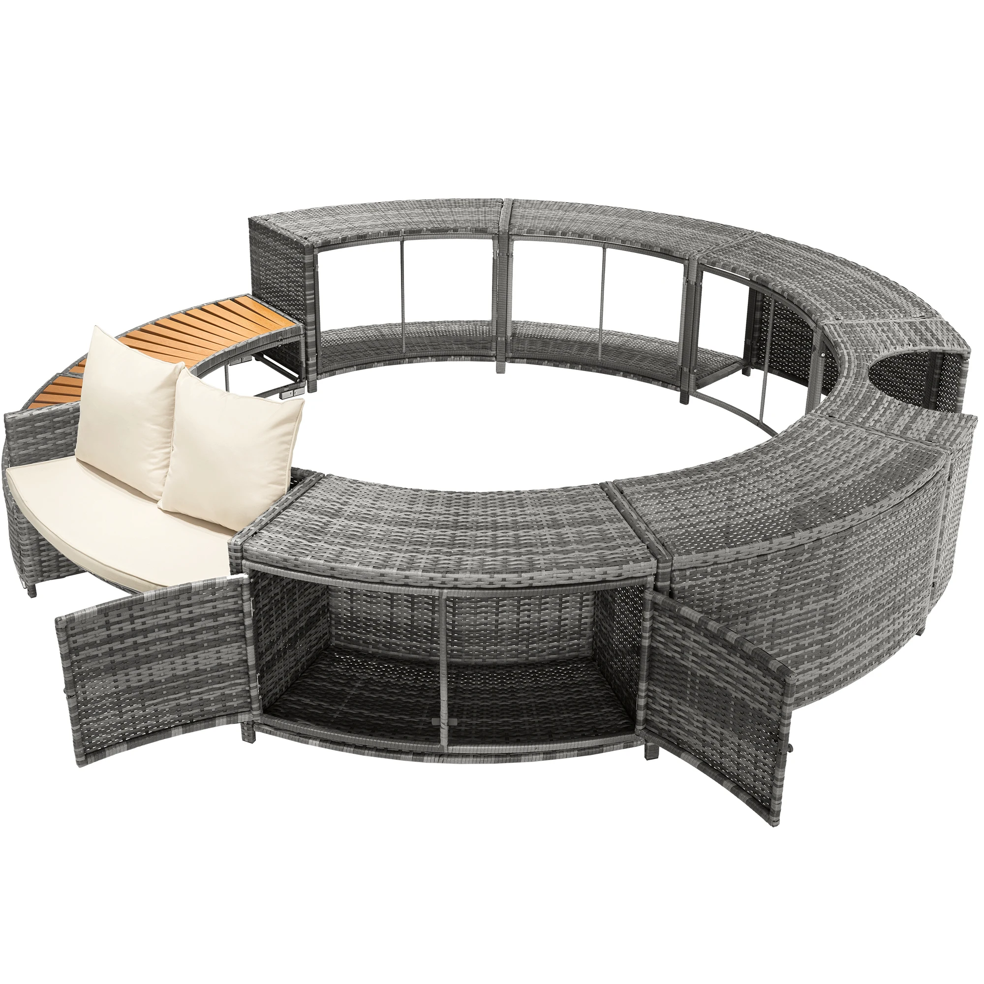 Diese Sofagarnitur verfügt über mehrere Stauräume, darunter Staufächer unter der Sitzfläche und an der Seite, die zur Aufbewahrung von Outdoor-Artikeln wie Kissen, Decken oder Zeitschriften genutzt werden können, um Ihren Außenbereich ordentlich und organisiert zu halten. Darüber hinaus ist eine Seite des Sofas mit einer kleinen ausziehbaren Holztischplatte ausgestattet, auf der Sie bequem Getränke oder Snacks abstellen können, um Ihr Leben im Freien entspannter und angenehmer zu gestalten.