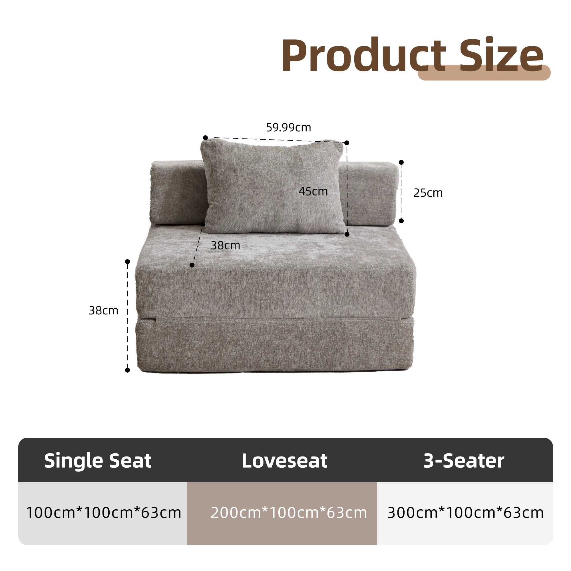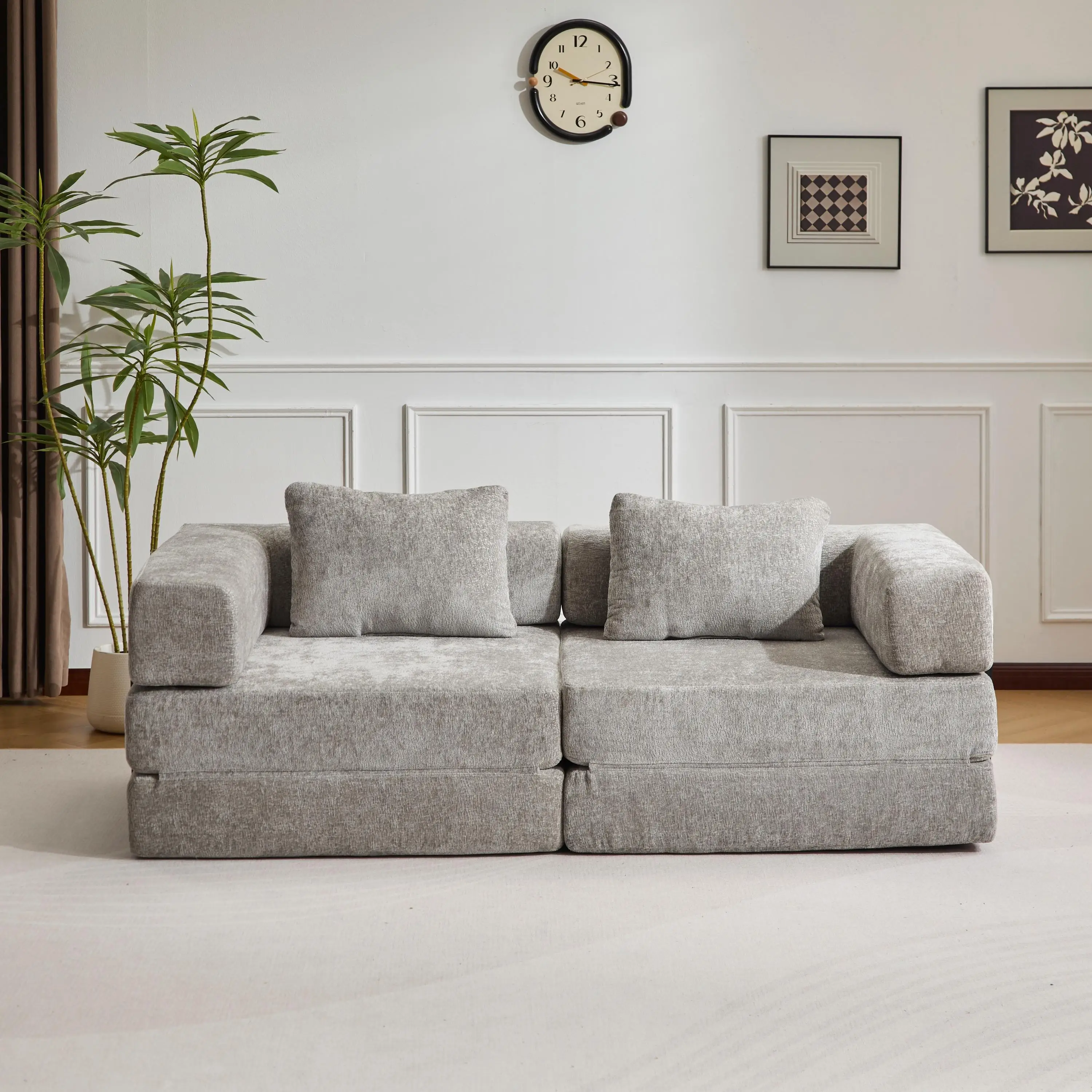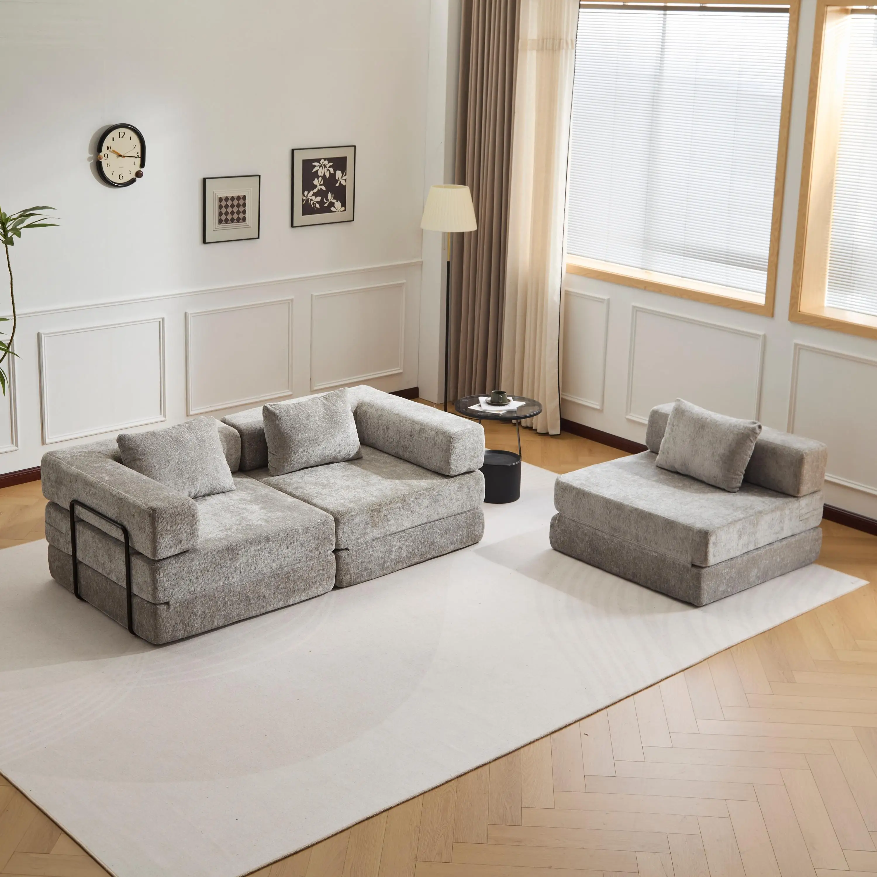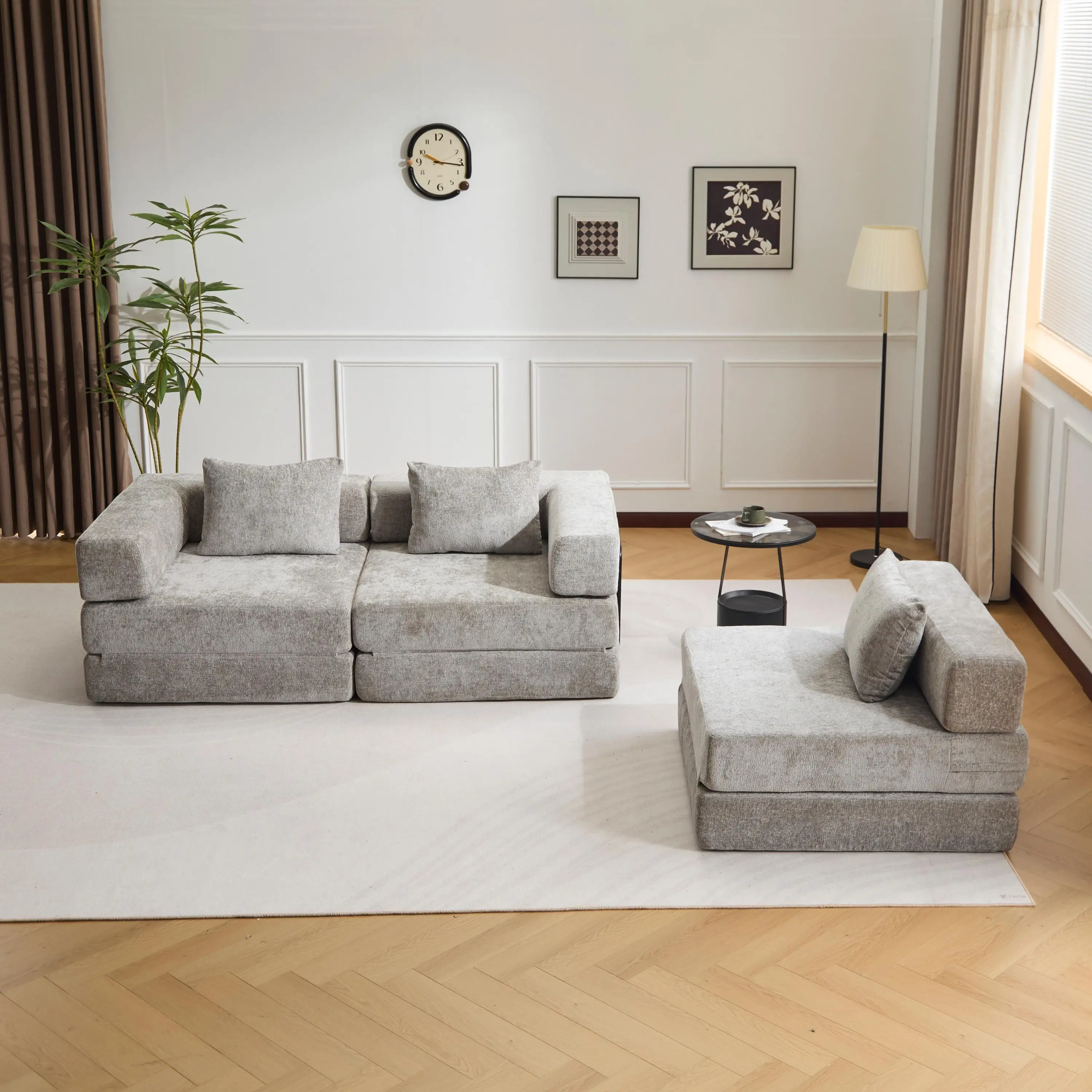 Grey Chenille Sofa Bed,Convertible Foldable Guest Bed with Pillows,3-Seater Loveseat Sofa,3-in-1 Modular Couch for Living Room