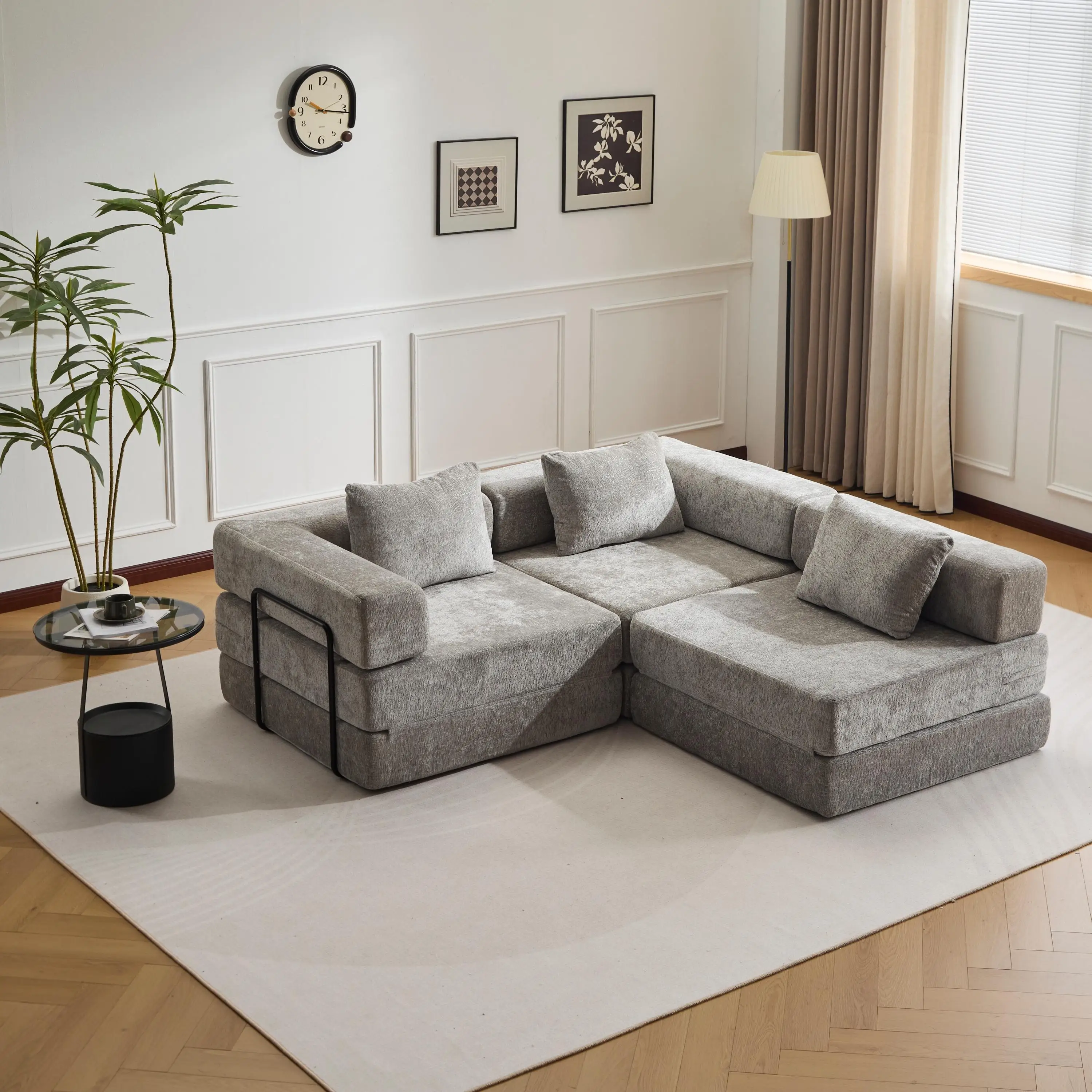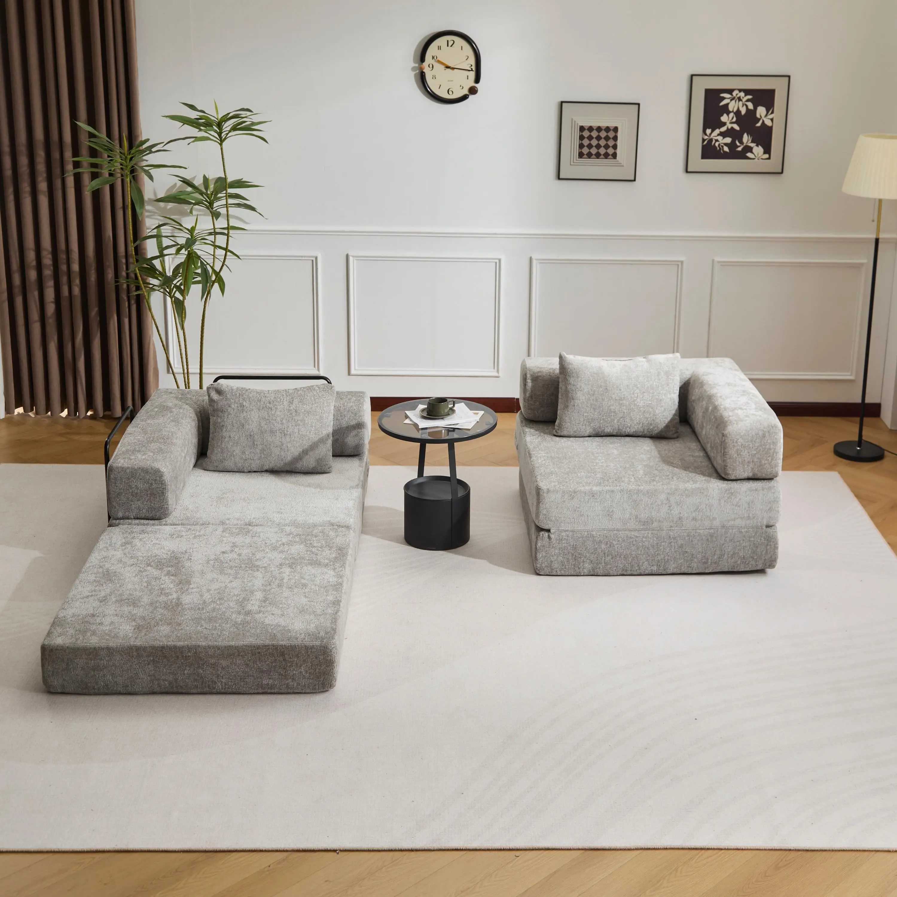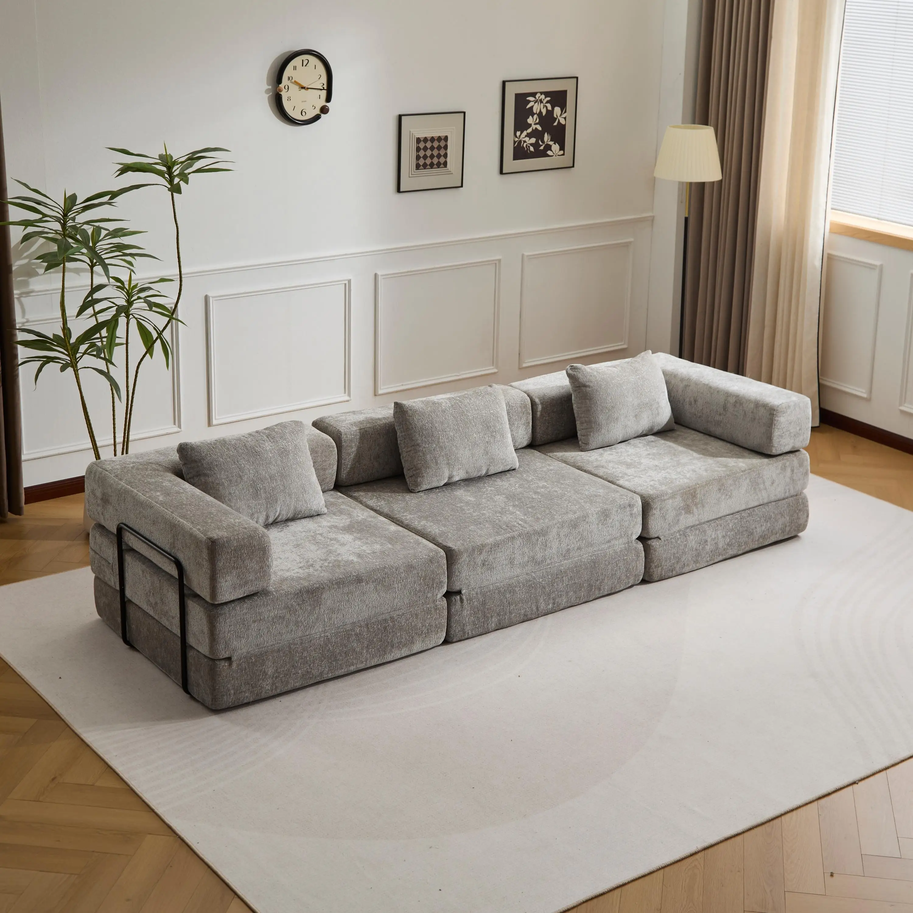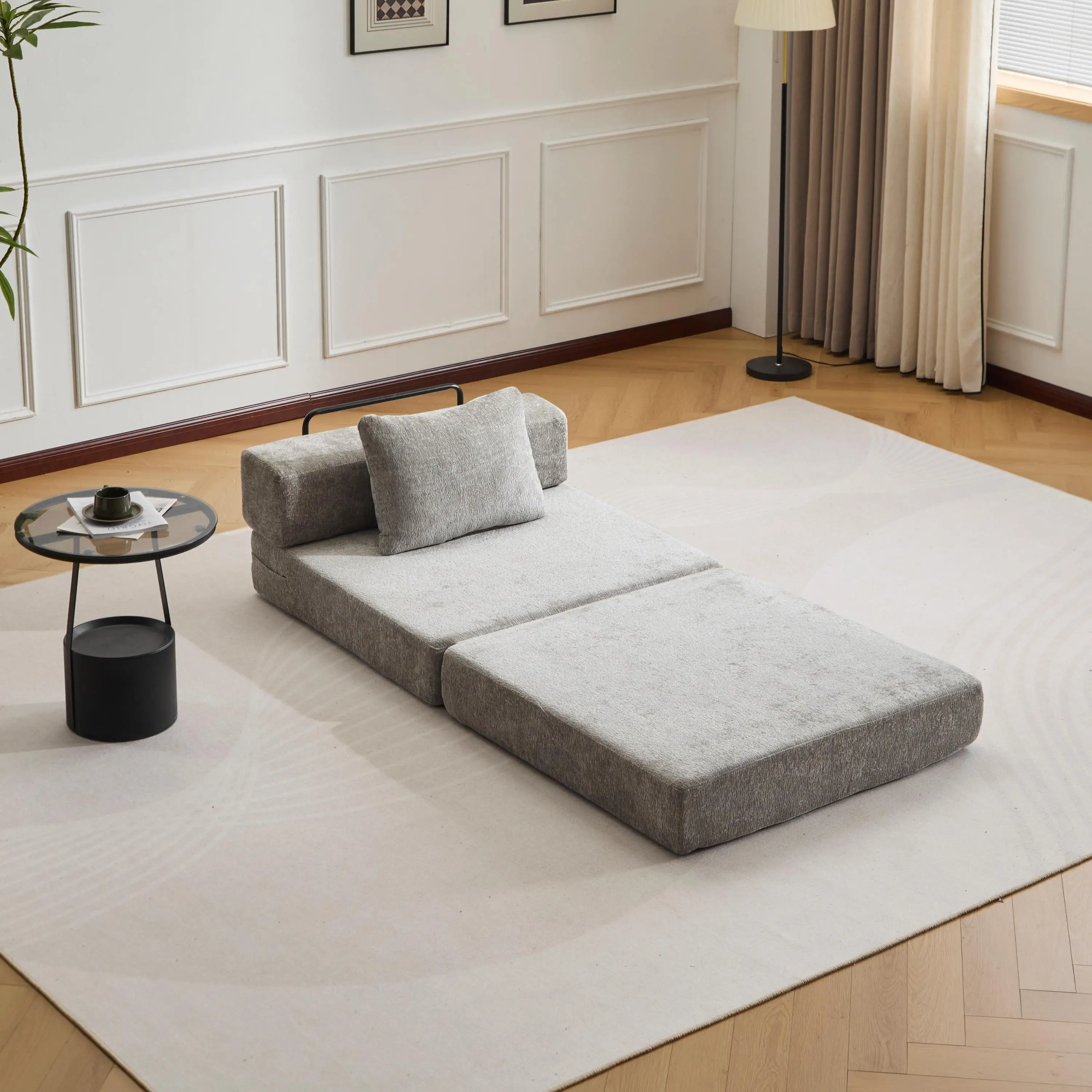 Grey Chenille Sofa Bed,Convertible Foldable Guest Bed with Pillows,3-Seater Loveseat Sofa,3-in-1 Modular Couch for Living Room