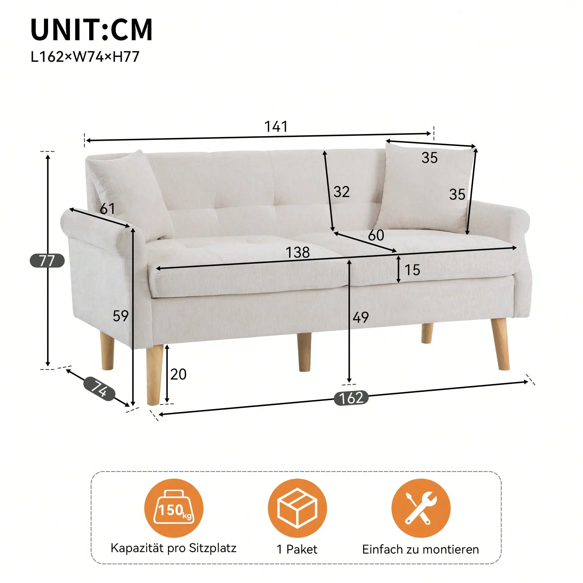 Sturdy sofa legs: made of solid wood, sturdy and with 20 cm height for easy cleaning of the sofa bottom.