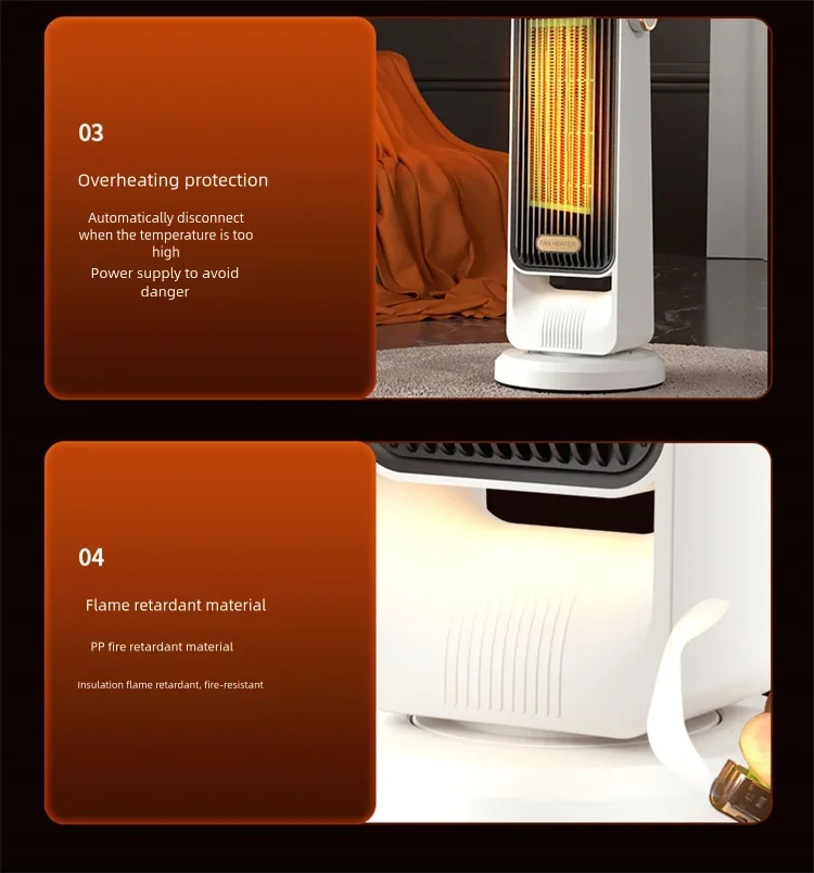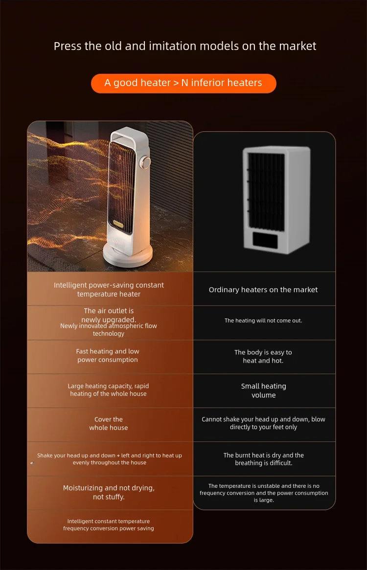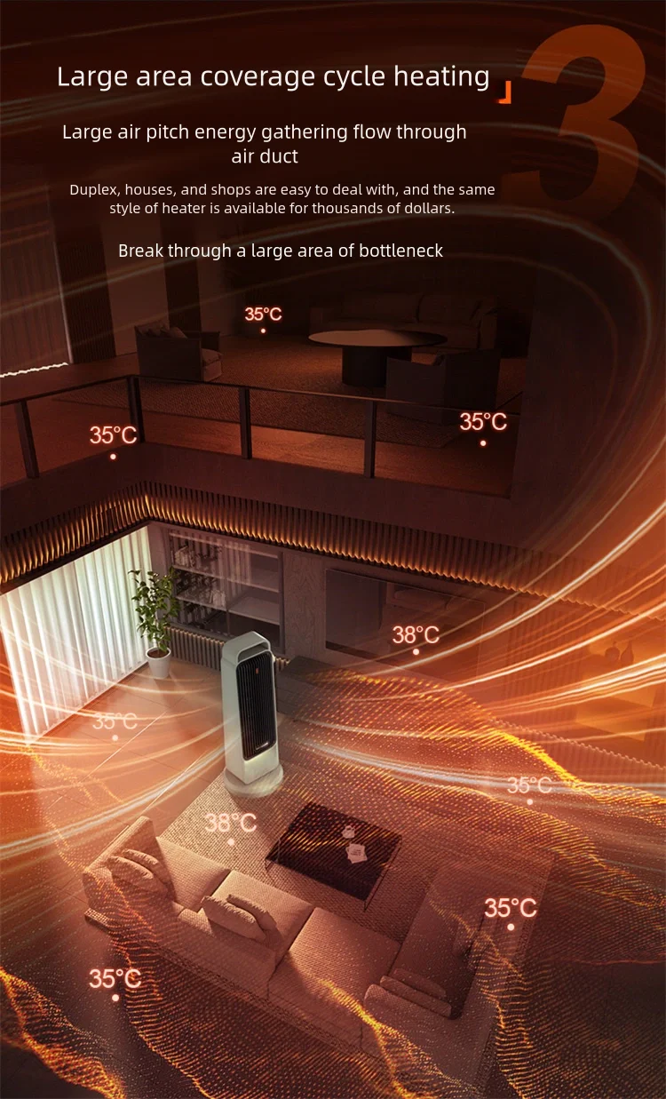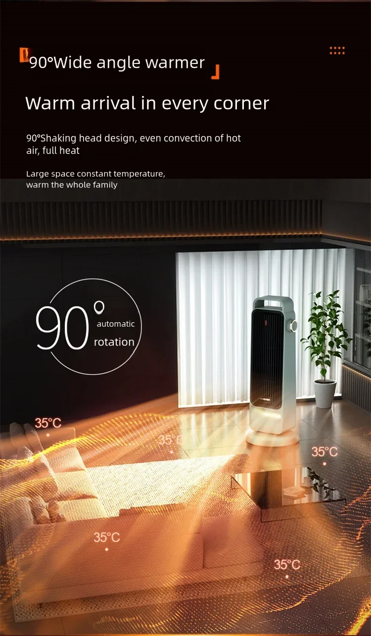 This is a heater with a maximum power of 2000W Its advantages are: 1. PTC heating fast 2.35-50 dB silent operation 3. Built-in temperature control system, safe and reliable 4. Flame retardant material to prevent burning 5. Dumping stops work safer 6. You can shake your head to increase the range and temperature